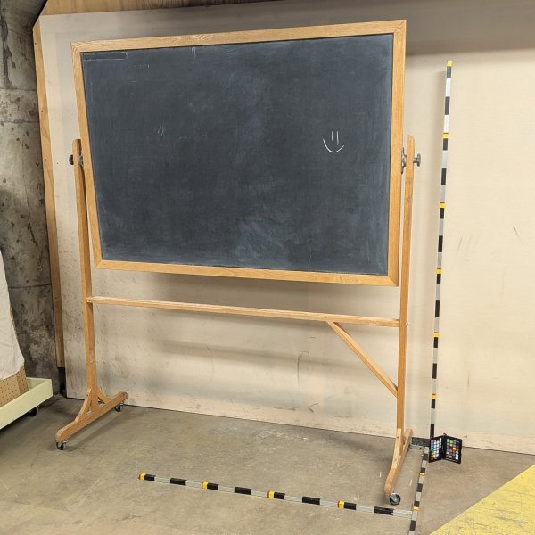 Double-sided chalkboard on wheels. Diagonal supports are curved on top.