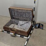 Functionality: Opens with center slide combination lock, and push in locks that are hidden under the leather straps. Stays open at 90 deg.