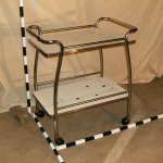 Chrome frame with laminate shelves. Bottom shelf is painted black.